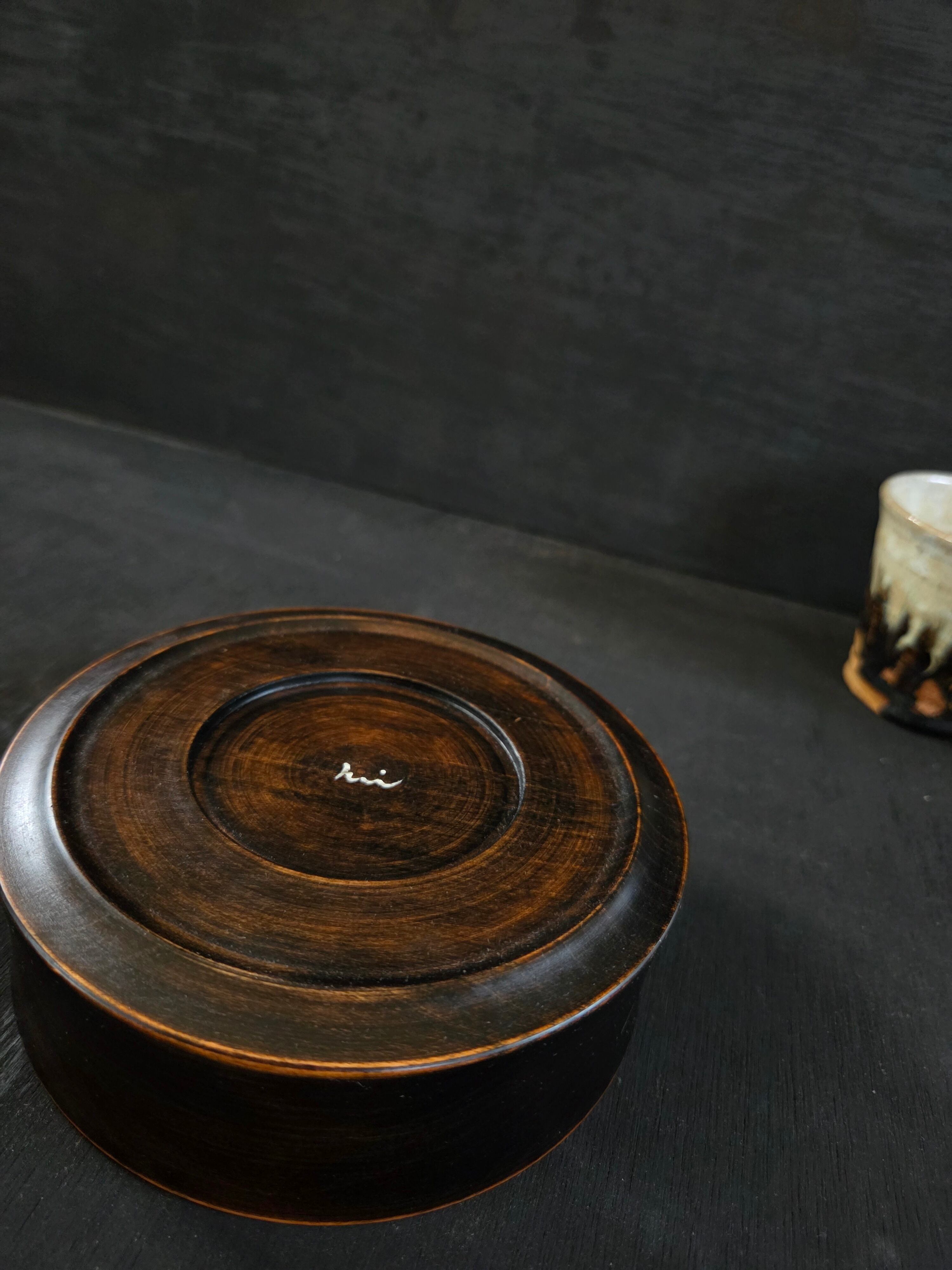 鉄染めした木の黒い肌がとてもシックで、高級感を演出します。菓子鉢としてだけでなく、色鮮やかな料理を一品盛り付けるのにもぴったりの器です。シンプルながらも存在感のあるデザインは、どんなシーンにも調和し、テーブルを引き立てるアイテムになります。