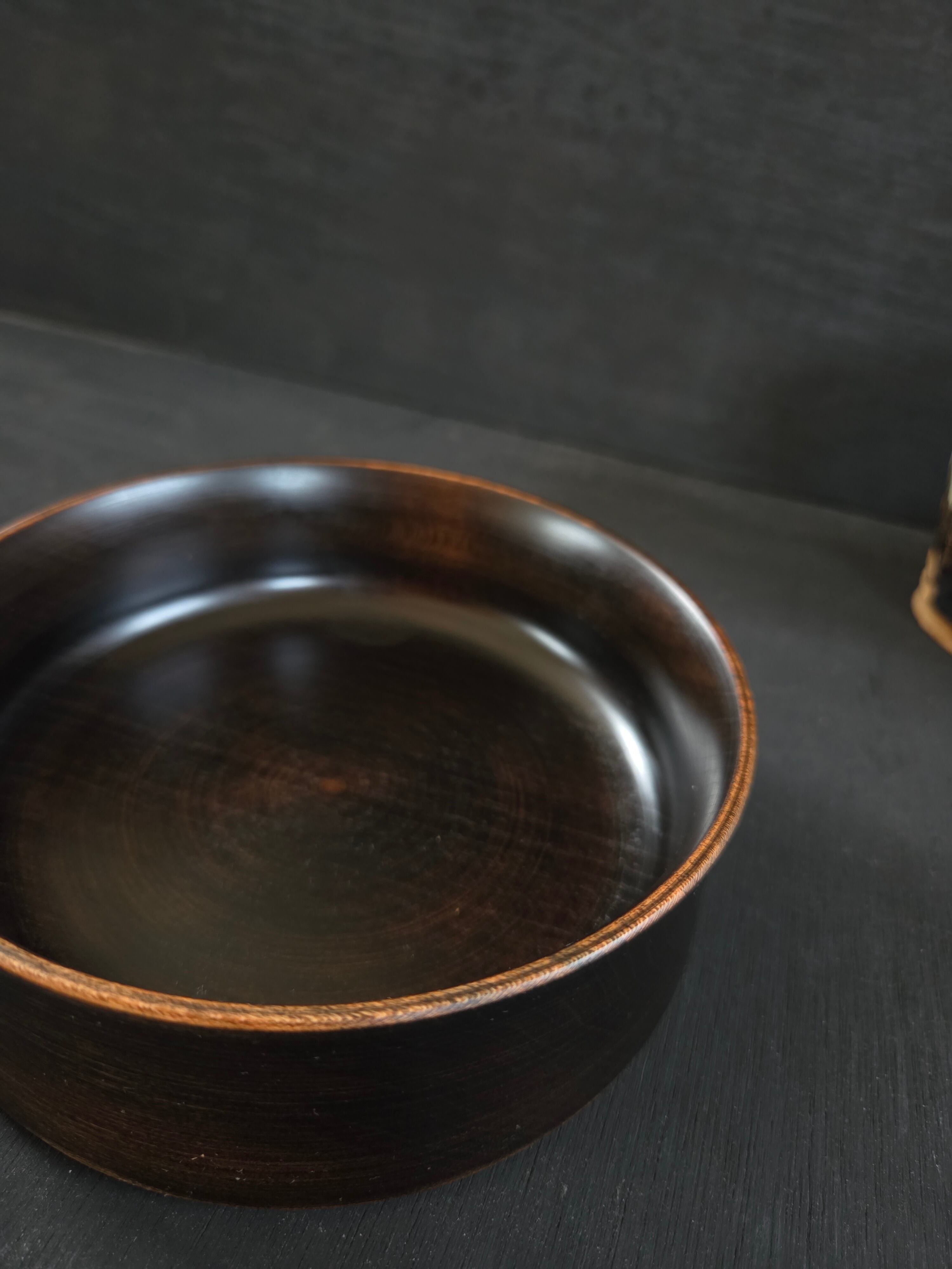 鉄染めした木の黒い肌がとてもシックで、高級感を演出します。菓子鉢としてだけでなく、色鮮やかな料理を一品盛り付けるのにもぴったりの器です。シンプルながらも存在感のあるデザインは、どんなシーンにも調和し、テーブルを引き立てるアイテムになります。
