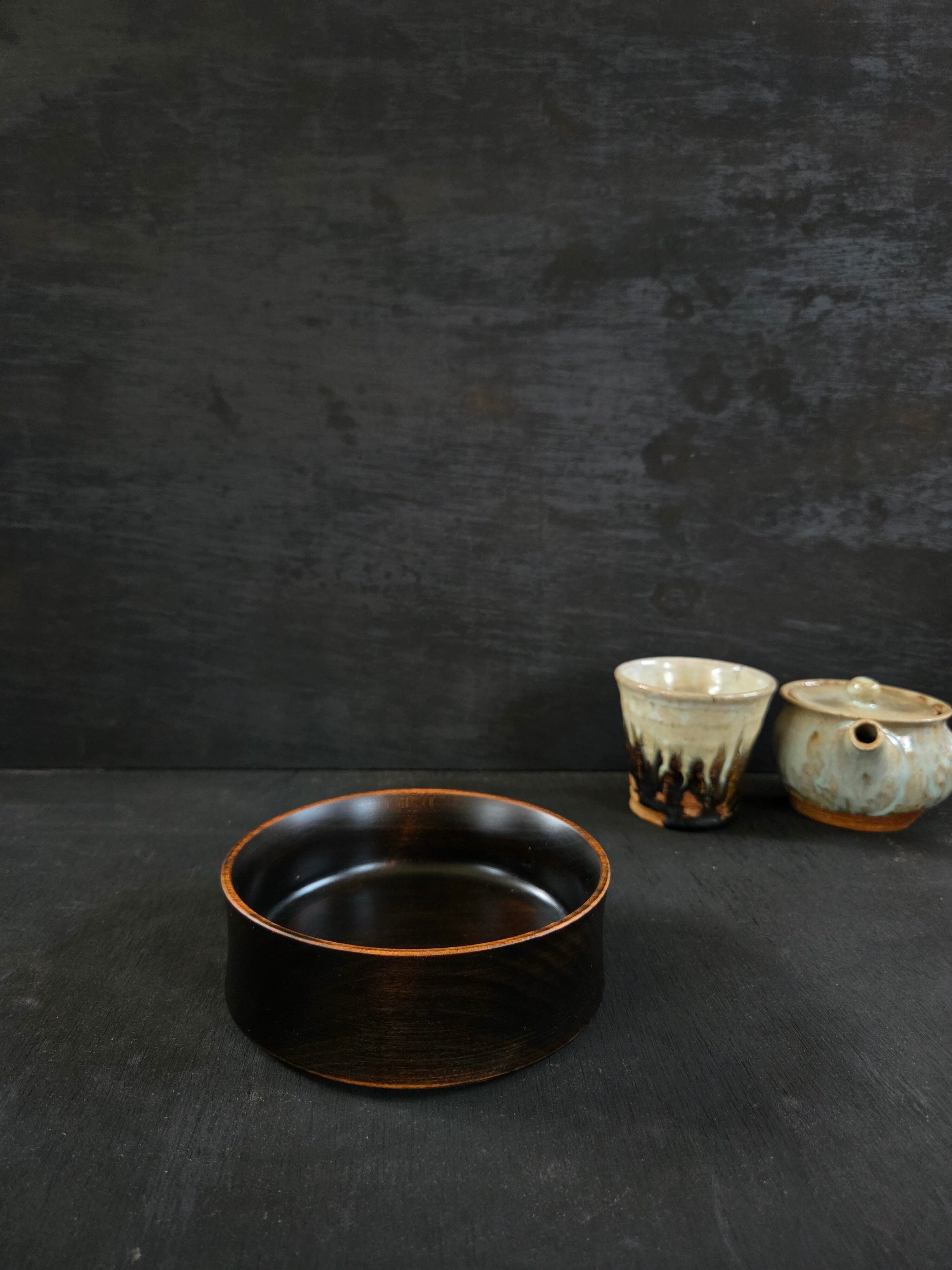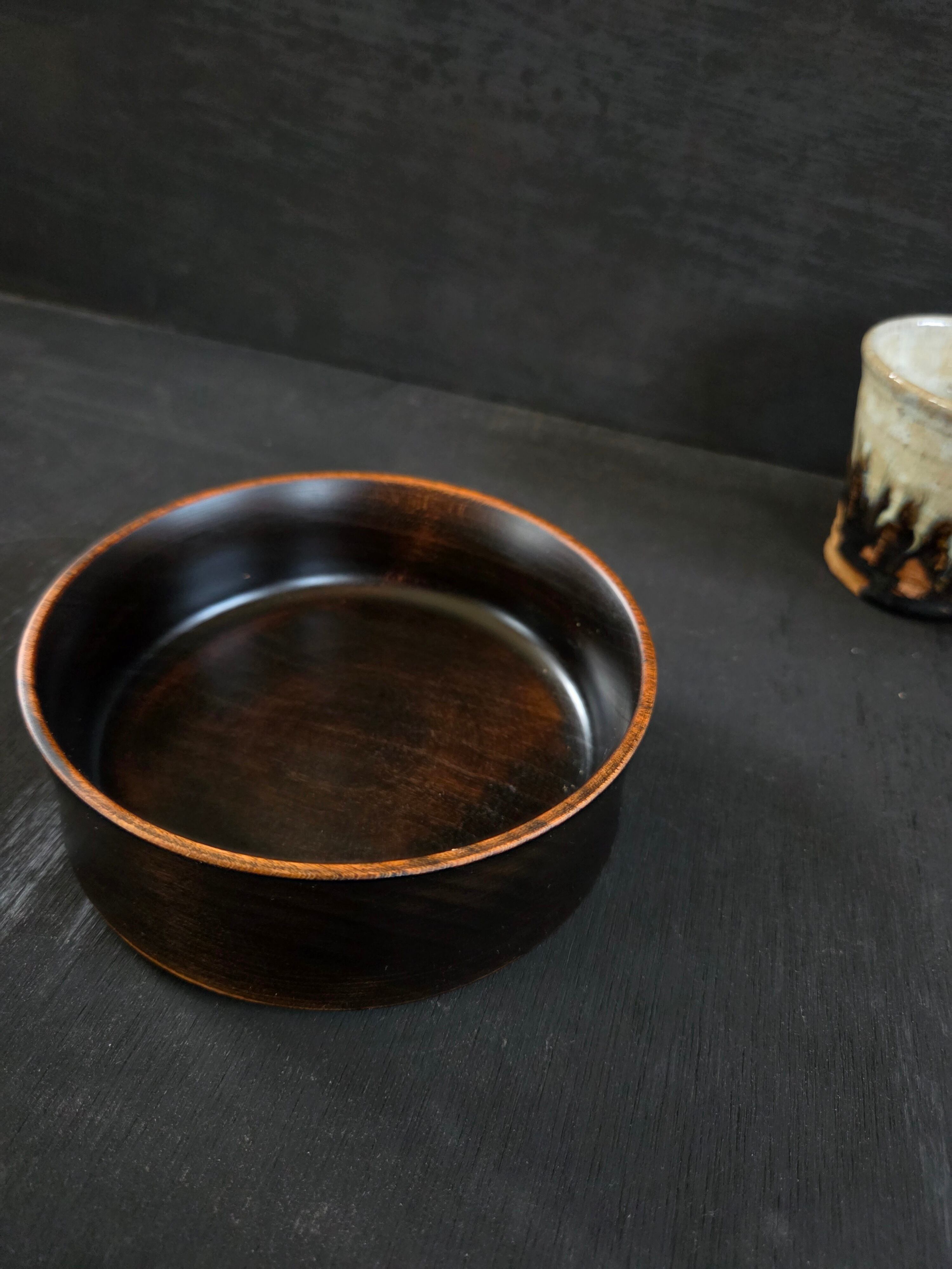 鉄染めした木の黒い肌がとてもシックで、高級感を演出します。菓子鉢としてだけでなく、色鮮やかな料理を一品盛り付けるのにもぴったりの器です。シンプルながらも存在感のあるデザインは、どんなシーンにも調和し、テーブルを引き立てるアイテムになります。
