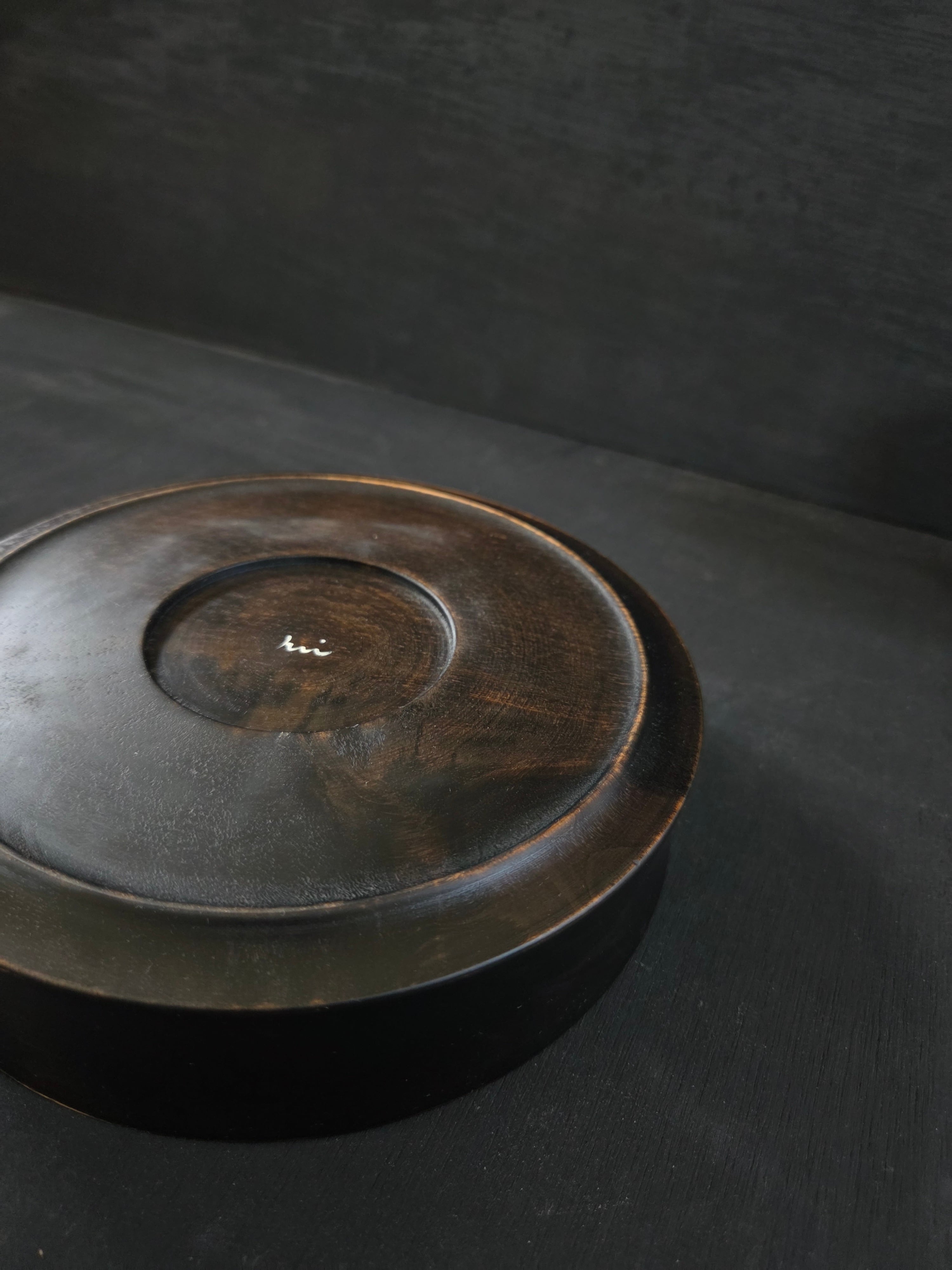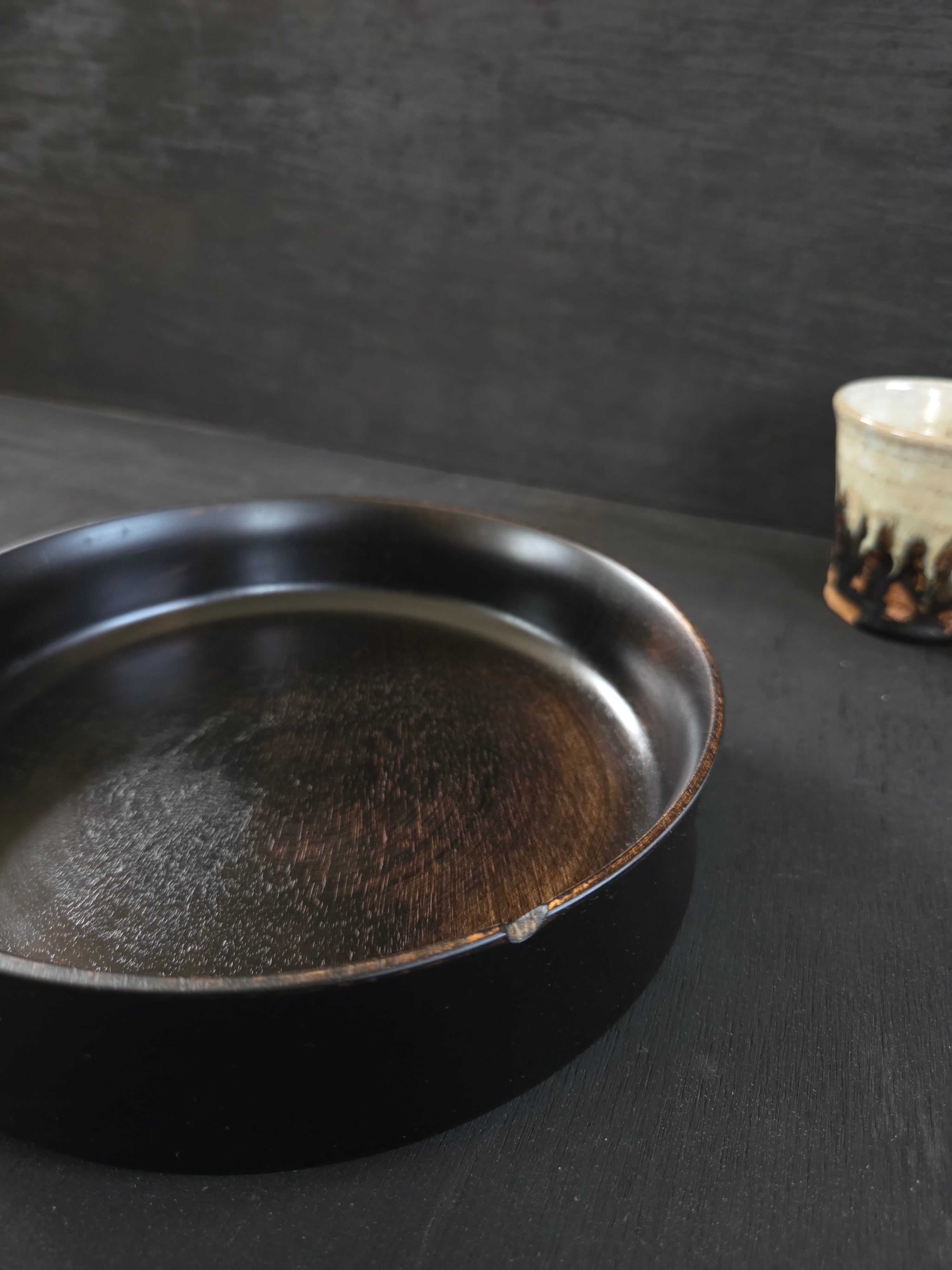 鉄染めした木の黒い肌がとてもシックで、高級感を演出します。菓子鉢としてだけでなく、色鮮やかな料理を一品盛り付けるのにもぴったりの器です。シンプルながらも存在感のあるデザインは、どんなシーンにも調和し、テーブルを引き立てるアイテムになります。